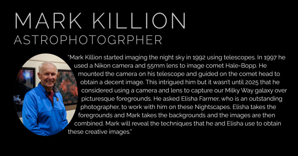 Join us for a special upcoming class on nightscape photography led by talented astrophotographer Mark Killion. Learn how to capture the beauty of the stars, night skies, and breathtaking landscapes after dark—no experience required!